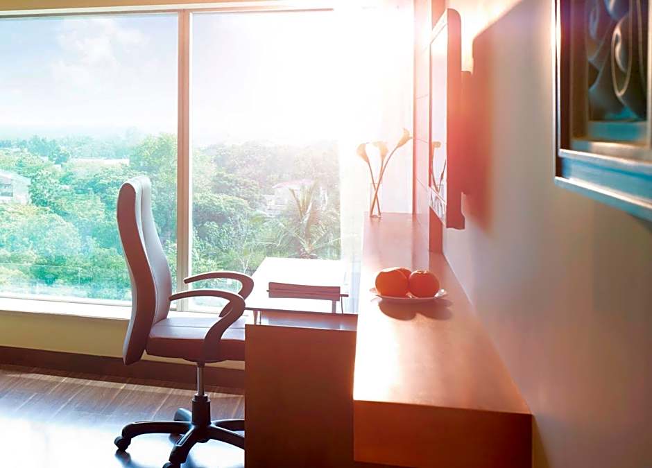 Spacious air-conditioned room is fitted with floor-to-ceiling windows with views of the city. Includes a flat-screen TV, mini-bar and personal safe. Bathroom has hot-water showers.