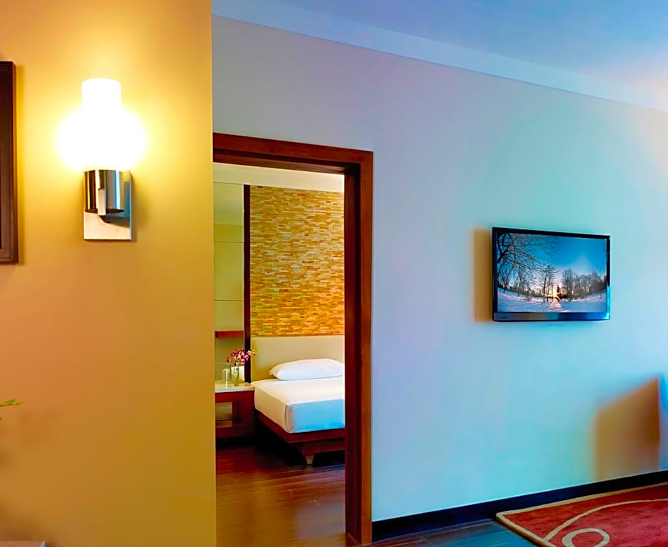 Spacious air-conditioned room is fitted with floor-to-ceiling windows with views of the pool and city. Includes a flat-screen TV, mini-bar and personal safe. Bathroom has hot-water showers.